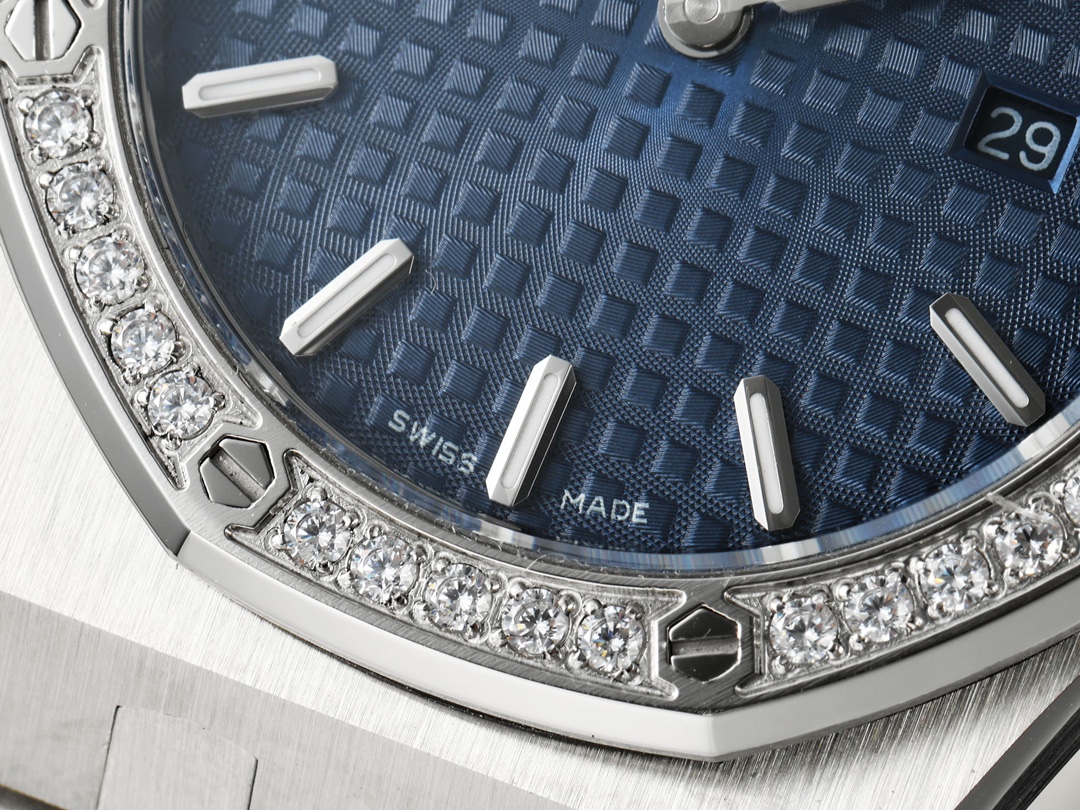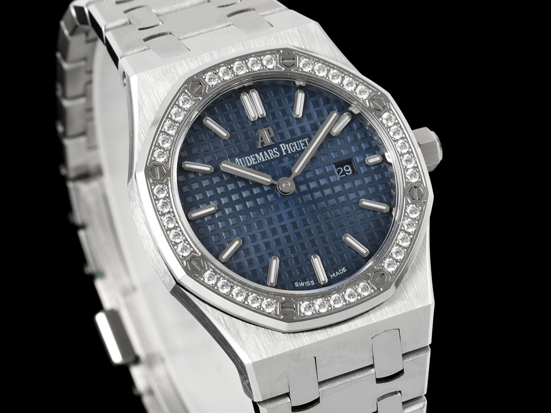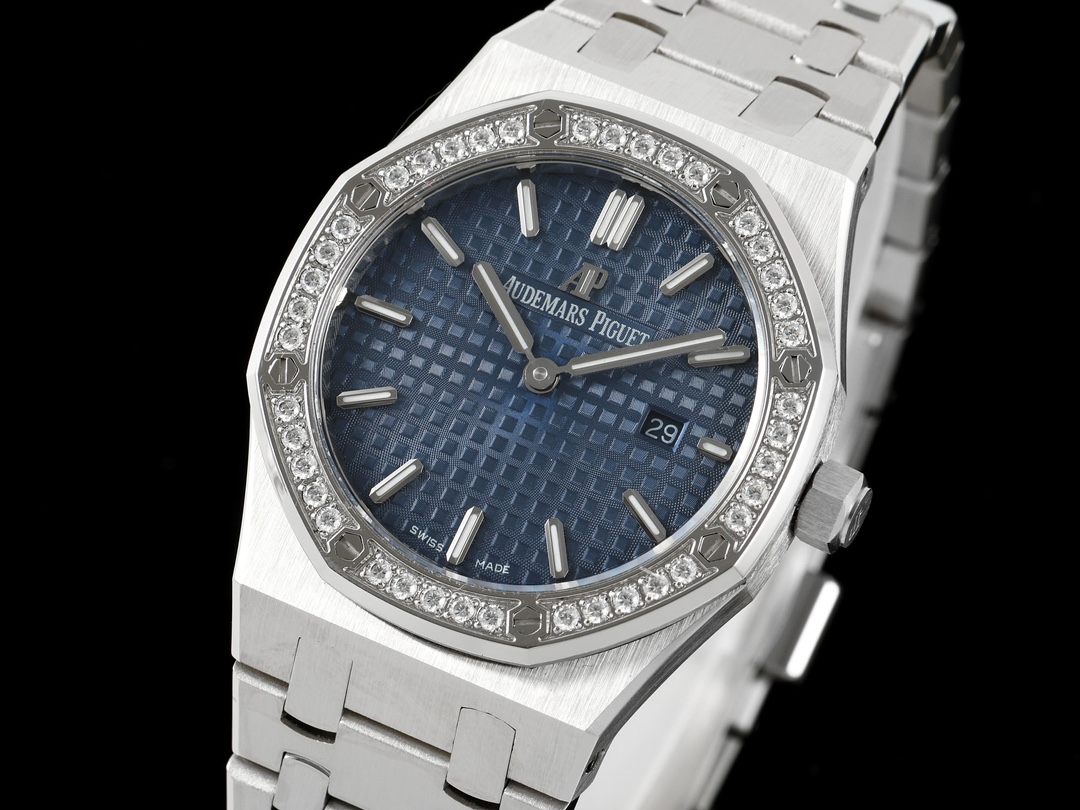 AUDEMARS PIGUET Royal Oak Series 67651OR Ladies' Quartz Watch ~ Shining debut! Goddess versatile style, sparkling and charming! The genuine product purchased through the APP is disassembled and mold-made. The entire process is CNC polished, and the pattern is checked and adjusted multiple times, with distinct edges and corners. The case diameter is 33MM. The multi-faceted bezel precisely fits the case. The bezel is fixed to the case with hexagonal screws (the bezel opening is set with exquisite Swarovski diamonds, dazzling and brilliant). The bracelet links are exquisitely and neatly arranged. The links have undergone hundreds of meticulous polishing processes, presenting a perfect texture. The folding clasp is easy to open and close and convenient to wear. The lugs of the watch are curved, which can ensure a better fit between the watch and the wrist. The dial is engraved with the "Grande Tapisserie" large checkered pattern decoration, paired with fluorescent three-dimensional hour markers and Royal oak hands. The wide hands and hour markers make reading the time simple and clear. The date display window at the three o 'clock position is shown in Arabic numerals. The wristwatch has a sealed case back, on which the English name of the Royal Oak series, "Royal Oak", is engraved. It is equipped with a Swiss F04111 quartz movement inside. Accurate timekeeping! APP production, making goddesses also very royal!