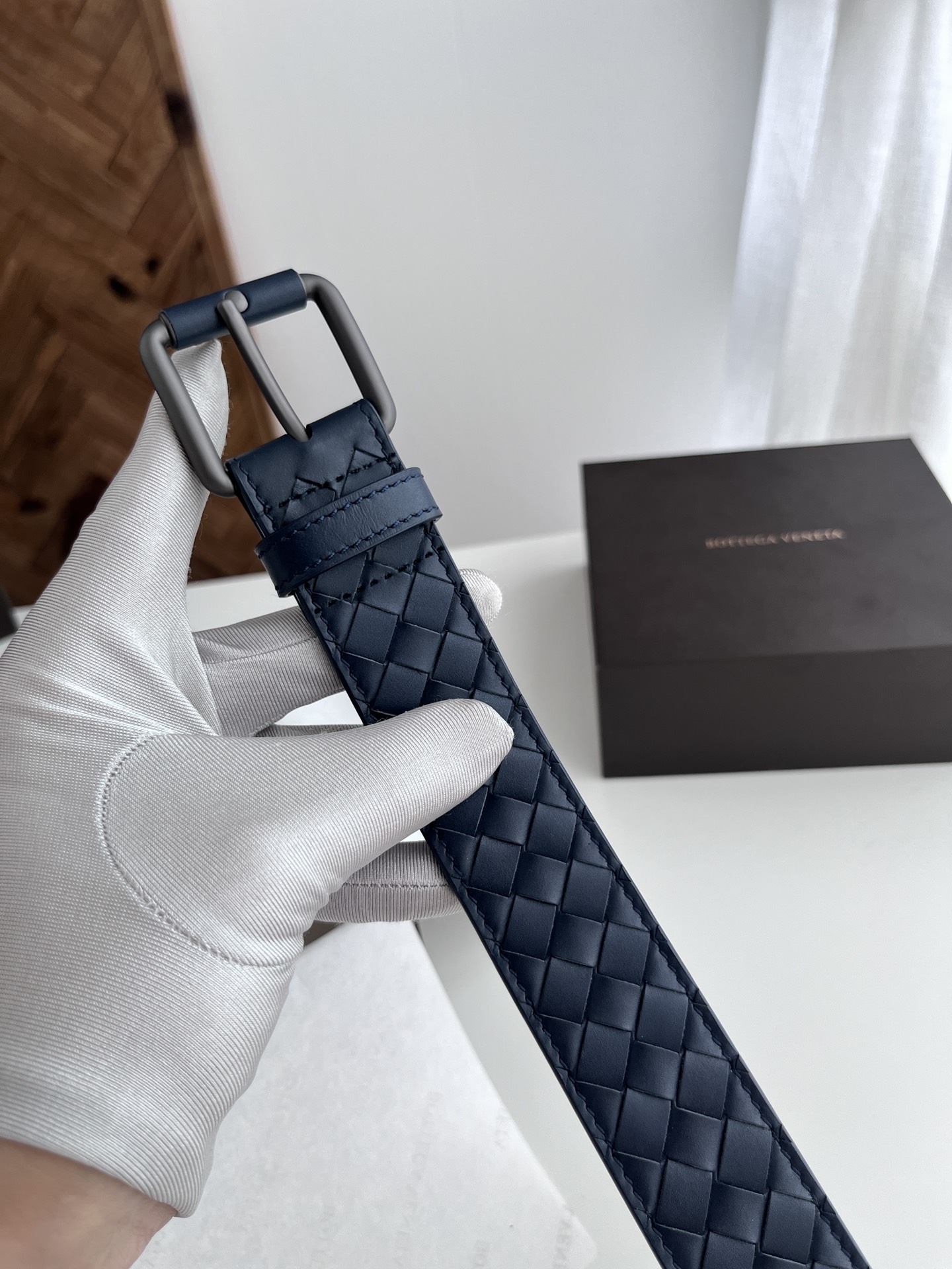 bv's new men's woven belt, intreccio, is made of Italian matte calfskin and hand-woven with small checks. It is paired with a matte gun-colored wrapped leather and a stud buckle. The width is 3.5CM and the color is dark blue