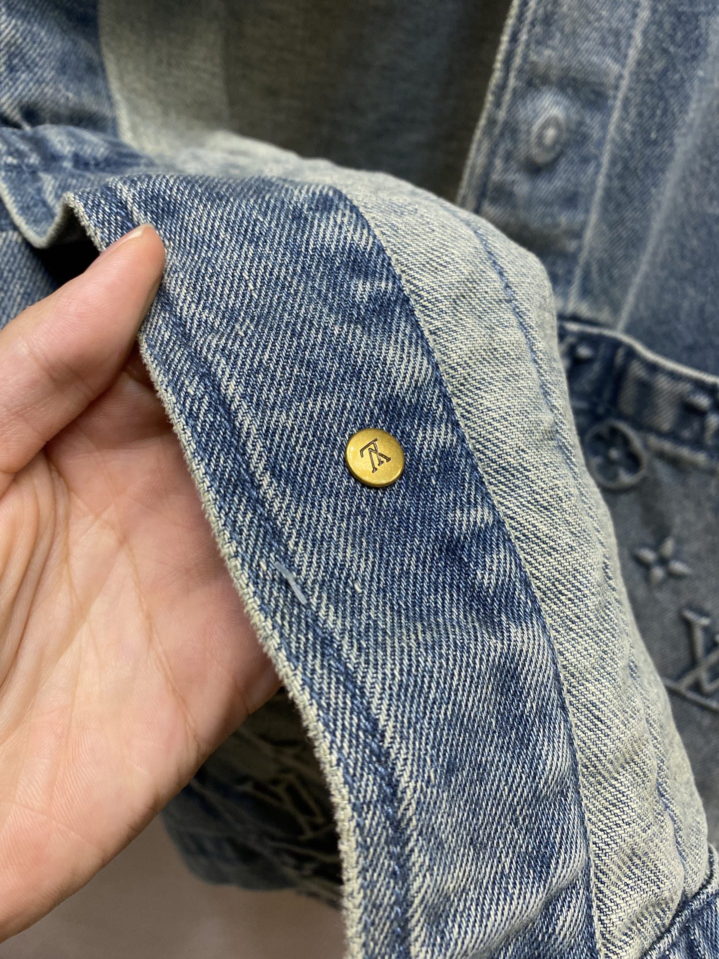????1V, the latest embossed denim shirt jacket for both men and women is available in stock This denim jacket integrates Monogram embossed pockets into the casual workwear silhouette. It can be paired with the same style of workwear pants to create a trendy look, or mixed and matched with other items to explore more fashion possibilities. Standard style, Monogram embossed structure, with LV square studs below the left sleeve, zipper front opening, 100% cotton. Size: S-XL