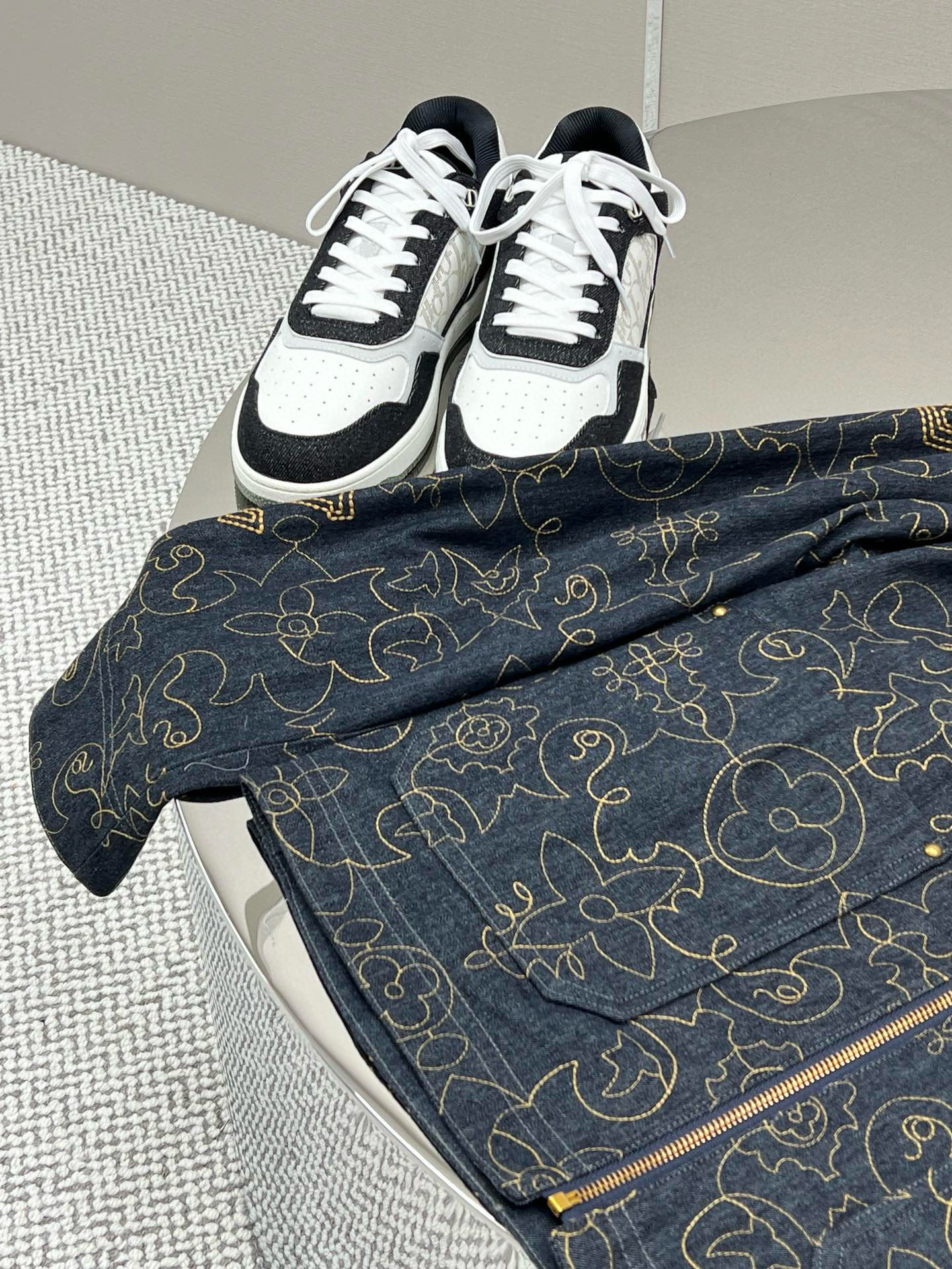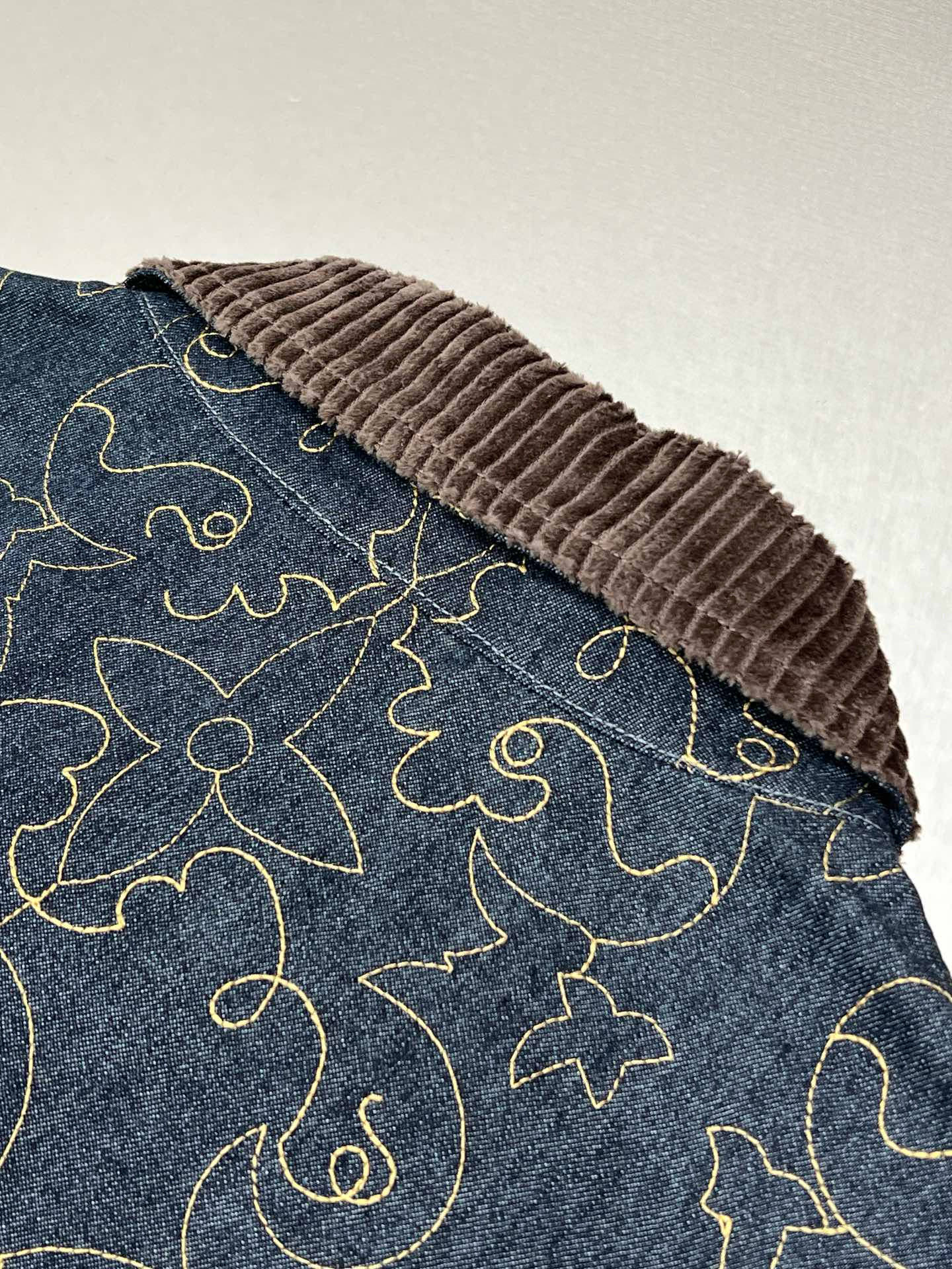 LV black and gold embroidered lapel denim jacket Process description The Monogram elements blend with the Western style The pockets and hem are embroidered with delicate patterns in contrasting color yarns The pattern sizing is precisely positioned for each cut piece. An imported extended single-arm embroidery machine is used to accurately position the flat embroidery process, ensuring that each cut piece is precisely aligned at the joint of the finished garment. The brand logo is located on the chest and back One of the Saddle embossed sticker finishing touch pockets Corduroy collar The front chest is covered with a cloth pocket The front of the zipper is equipped with an engraved zipper pull The inner lining adds comfort Unisex style Customized labels, tags and washbasin labels, high-quality products. Size: M-3XL