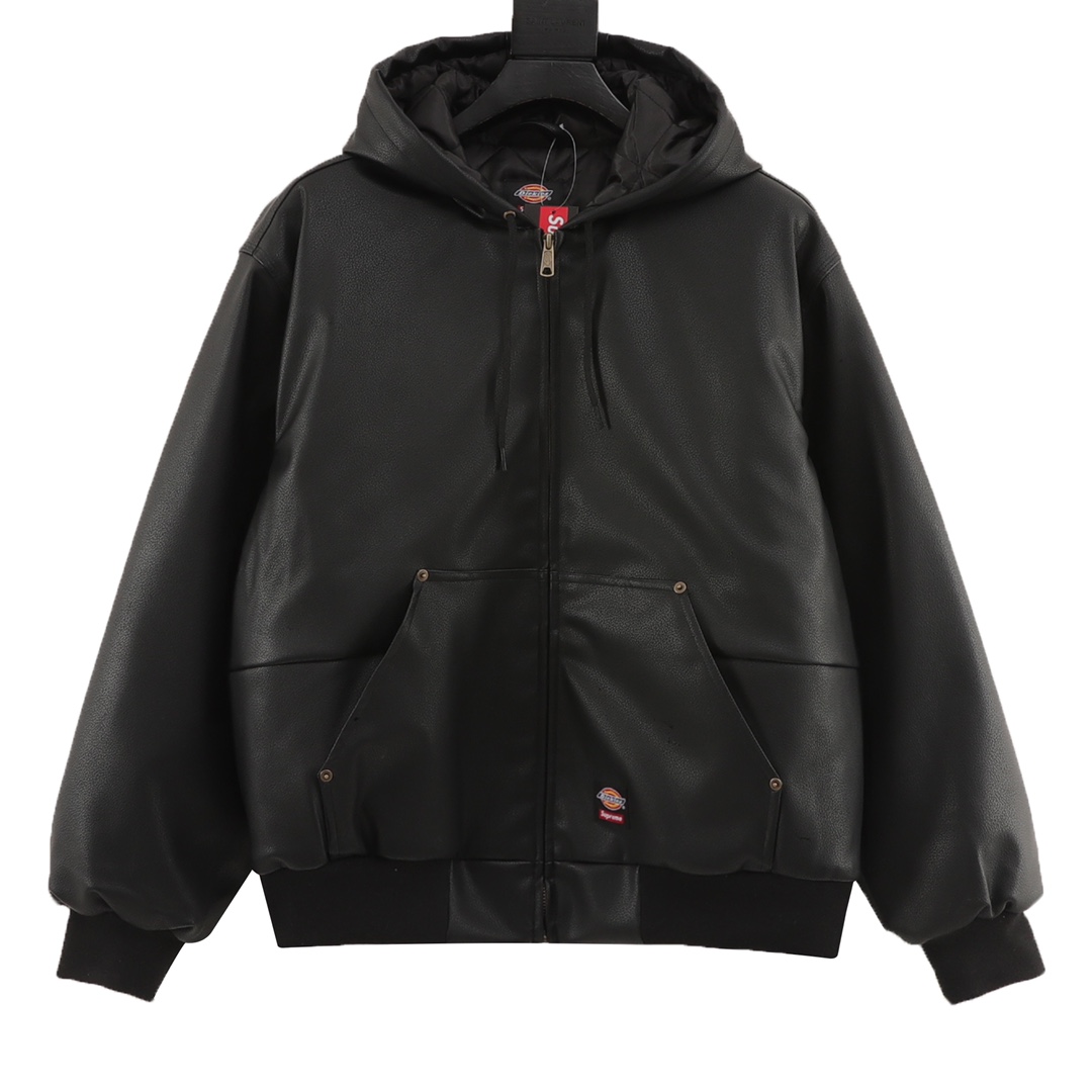 Supreme x Dickies collaboration FW24 WEEK16 Hooded Leather Work Jacket Lychee textured leather Jacket Supreme streetwear style and Dickies workwear silhouette, both signature LOGO words combined to show identity custom zipper accessories Double tag inside thin cotton not bulky to wear while keeping warm 5 ?? recommended Colour: Black Size: S-XL (178 145 wearing M)