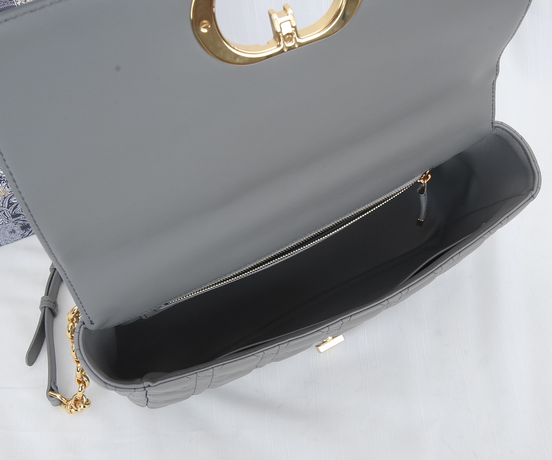 Dior has imported sheepskin inside The Dior Caro handbag is elaborately crafted from grey cowhide and decorated with the signature rattan checkered stitches. The material is soft. The flip cover is decorated with a retro gold finish metal "CD" clasp, inspired by the seal of Christian Dior perfume bottles. The small-sized style comes with a detachable signature "CD" chain shoulder strap, which can also be replaced with an embroidered wide shoulder strap for a more elegant and fashionable look. Whether it's a daily look or a dinner party Dimensions: 28x17x9CM