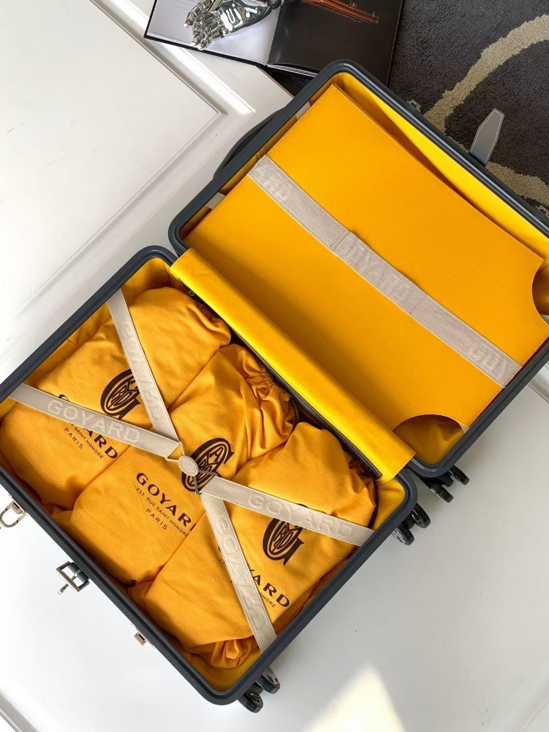 goyard has always been committed to the classic inheritance of travel products. This carry-on suitcase is also a classic work of goyard. It is also the peak of retro refinement, where one can feel the exquisite workmanship and a strong sense of European retro style. Exquisite pure steel hardware, hand-stitched and assembled, brings a visual impact and unparalleled noble texture, giving you an extraordinary temperament!! Flexible swivel wheel design, pure manual assembly process is long and requires customization! No urgent orders! A genuine haute couture collection! Size: 20-inch carry-on suitcase. 37x27x55cm