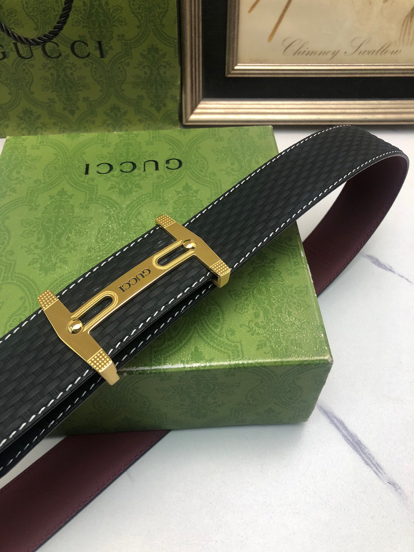 Gucci: Original single-grain calfskin with embossed patterns, lined with plain cowhide base, creating a woven appearance. Decorated with the original single buckle of the logo. The counter width is 4.0