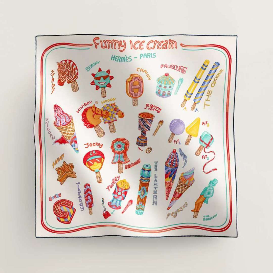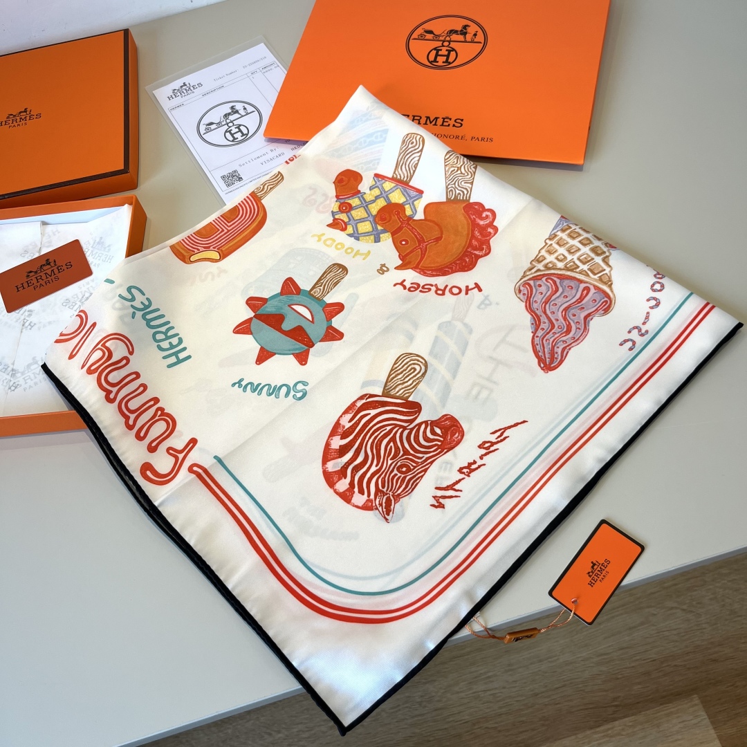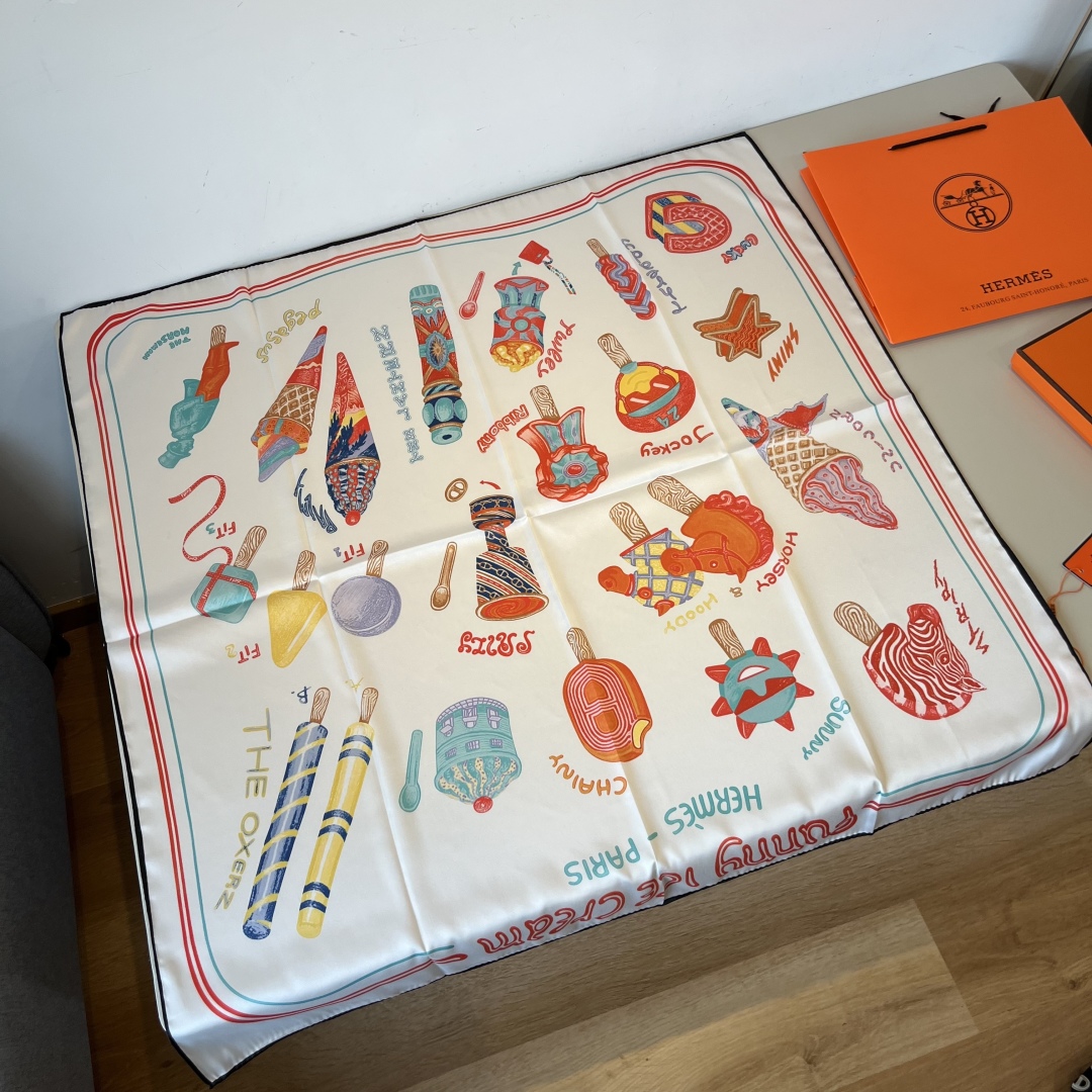 Hermes Silk Handkerchief (100% mulberry silk) [Fun Ice Cream] The designer Elias Kafouros interwove and collided lightness, boldness and endless playfulness in the handkerchief, immerging himself in the silk with charming texture. Wear this handkerchief in a versatile, creative and playful way to showcase a fashionable, modern and relaxed style. Size:90x90cm