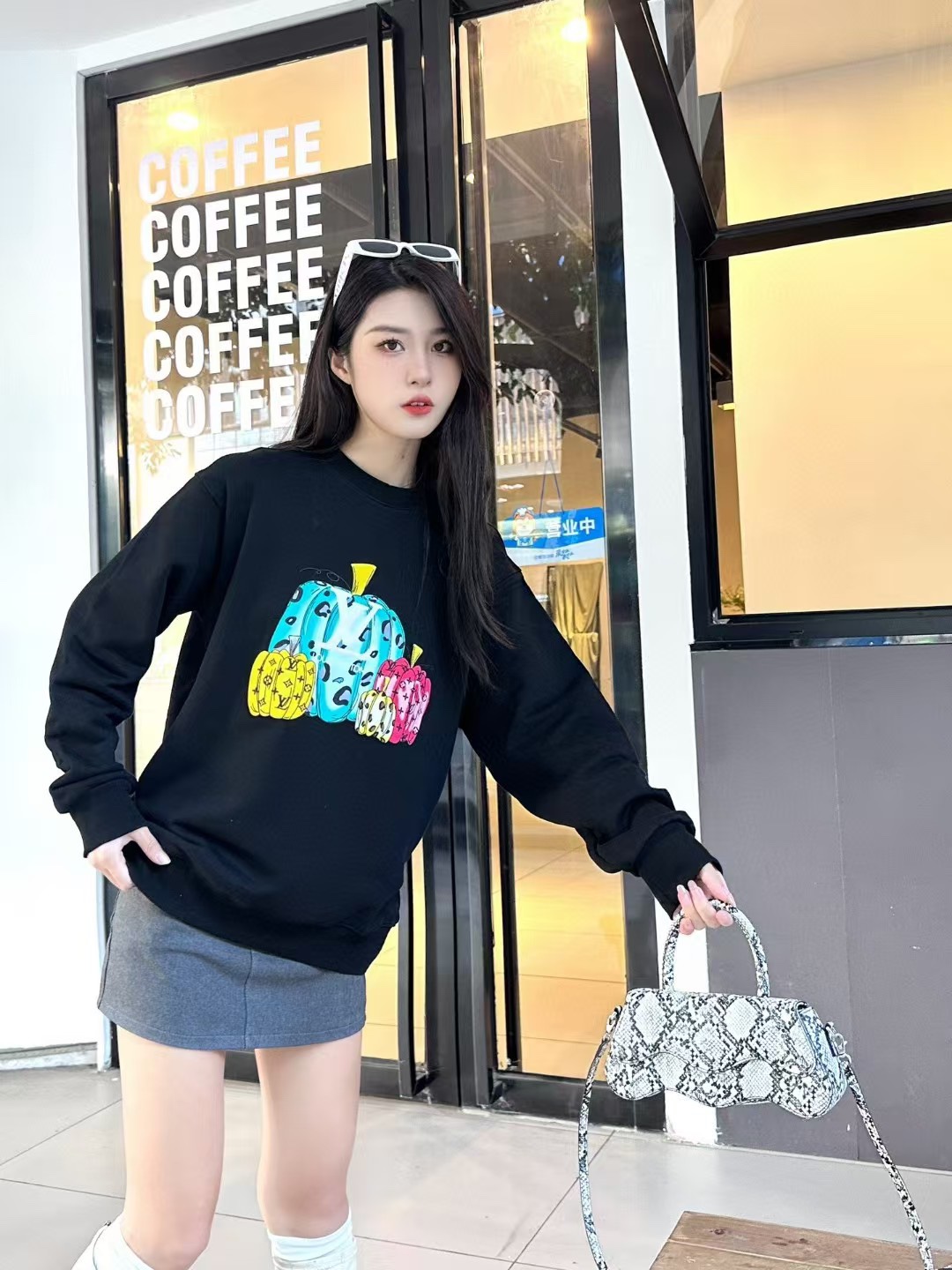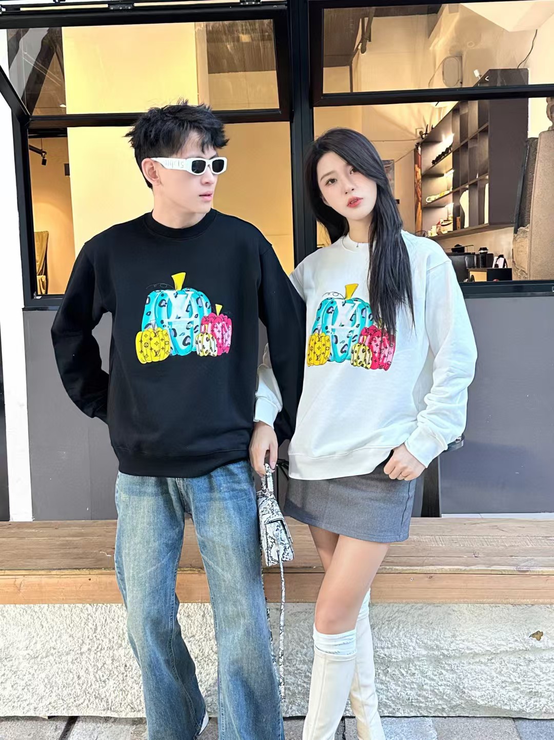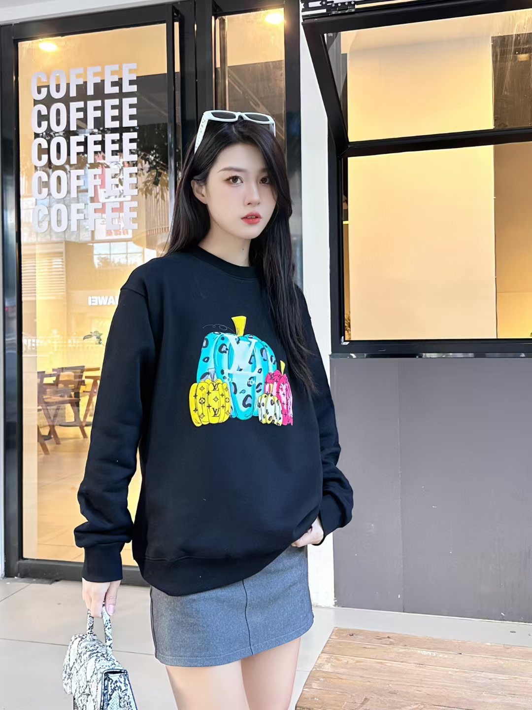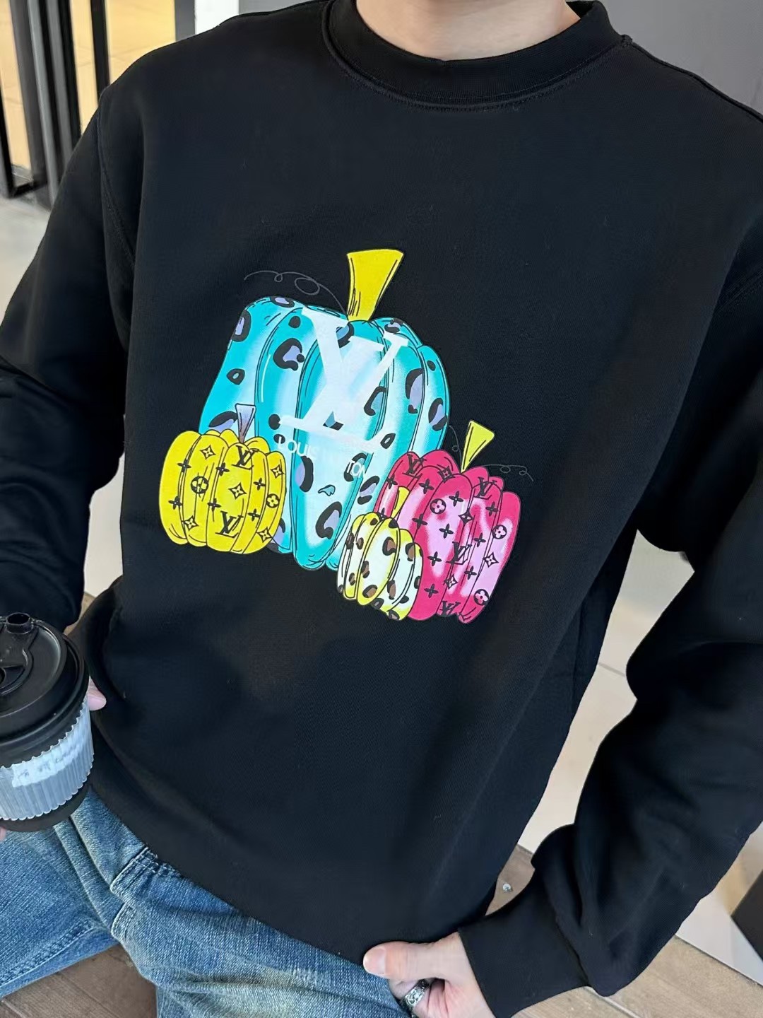 The wearing effect of the Louis Vuitton/ Louis Vuitton colored suede foamed pumpkin round-neck sweatshirt #