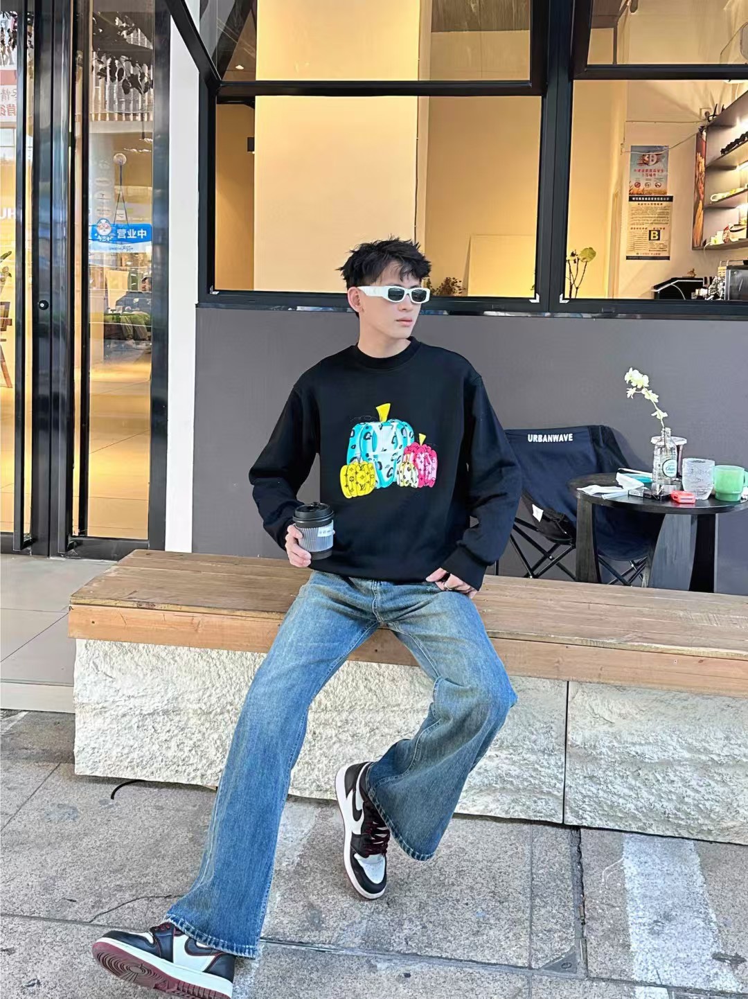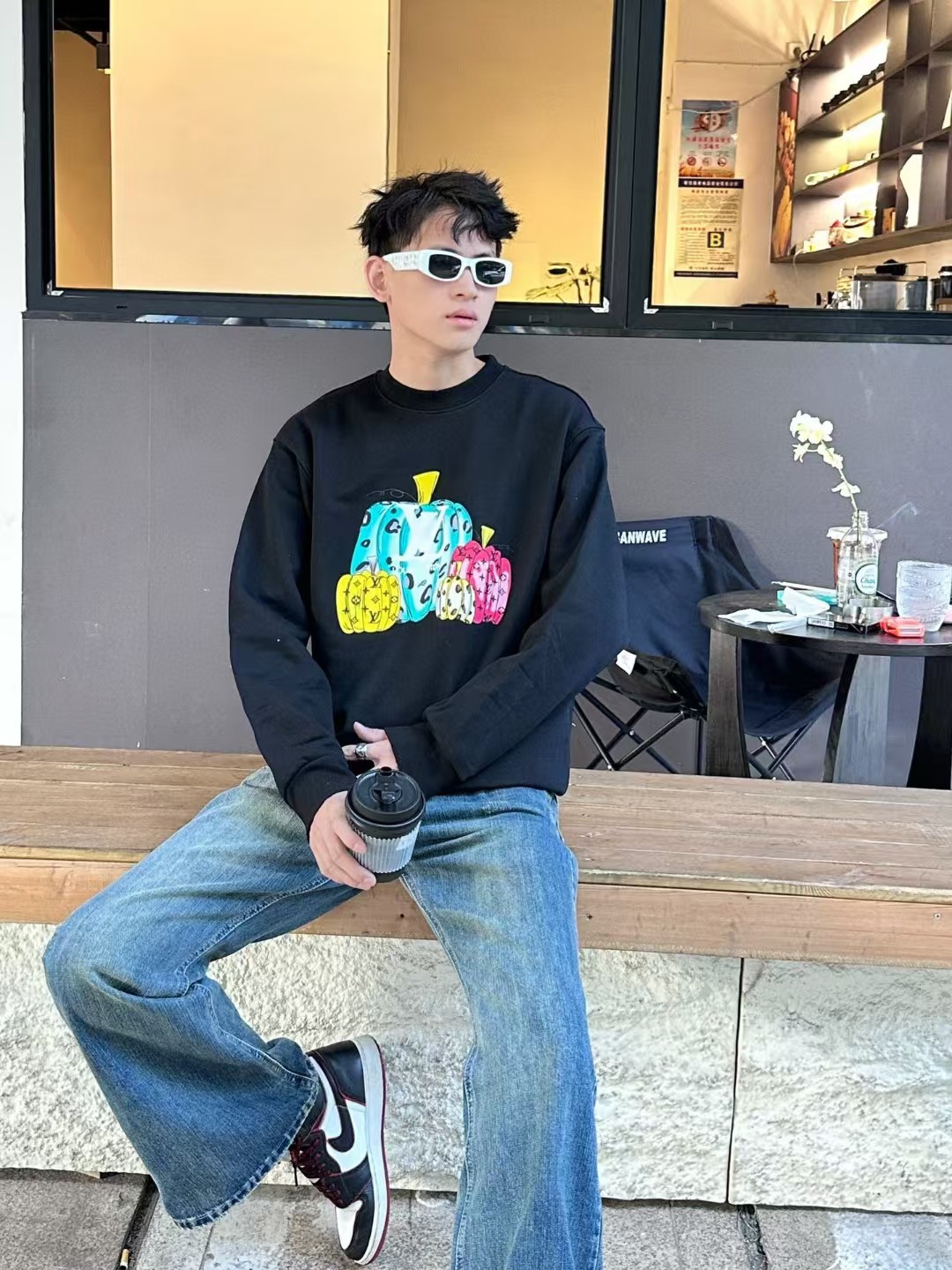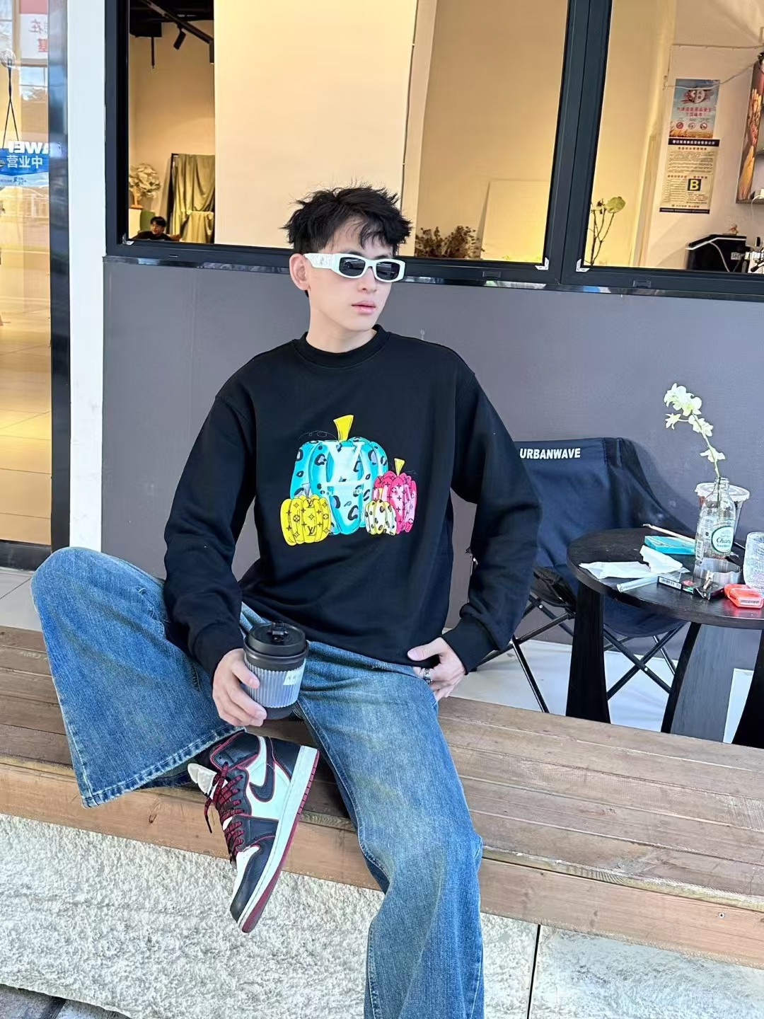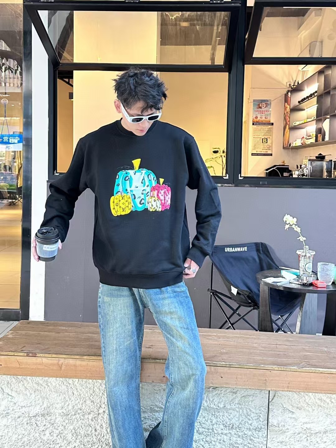 The wearing effect of the Louis Vuitton/ Louis Vuitton colored suede foamed pumpkin round-neck sweatshirt #