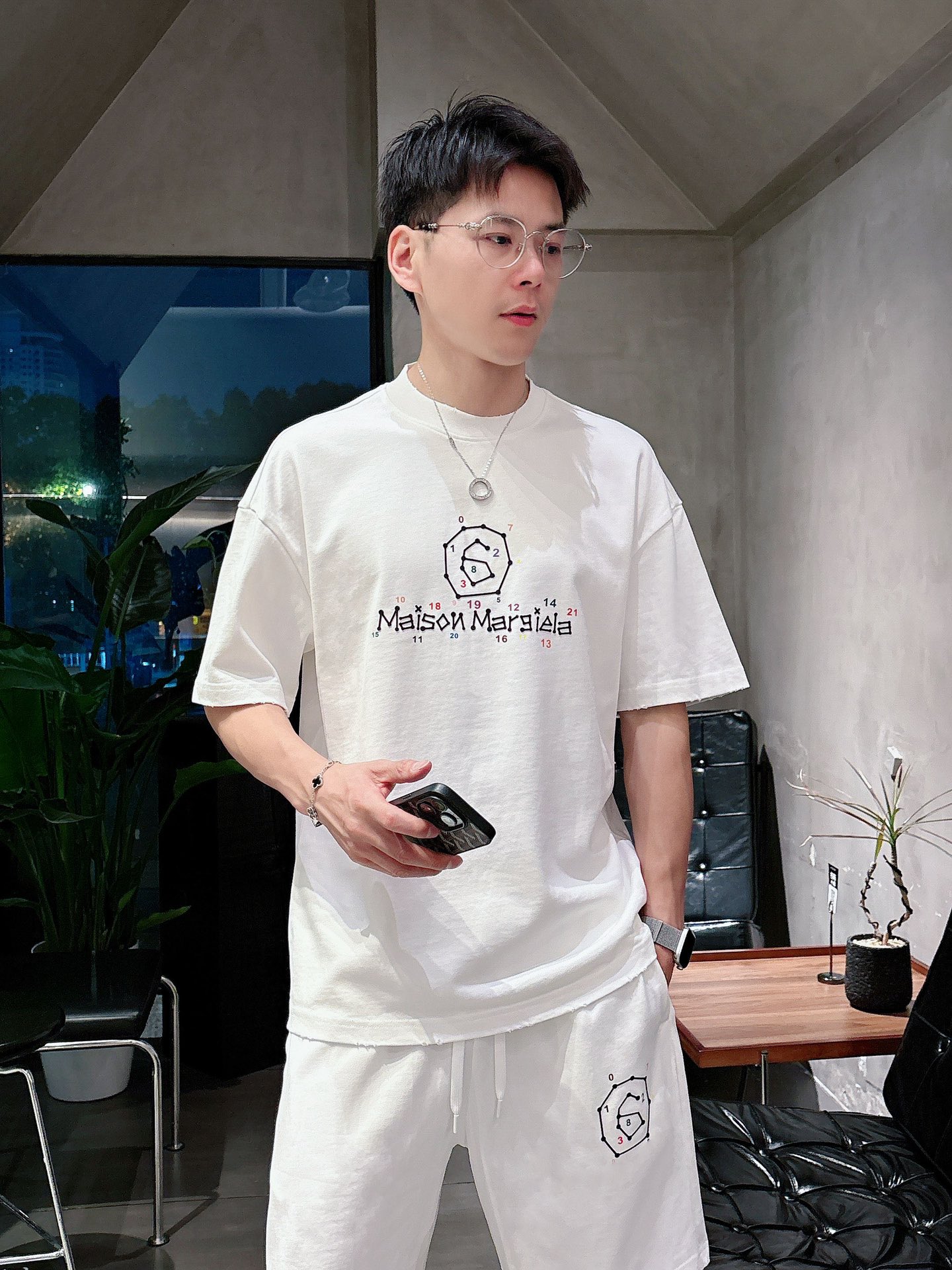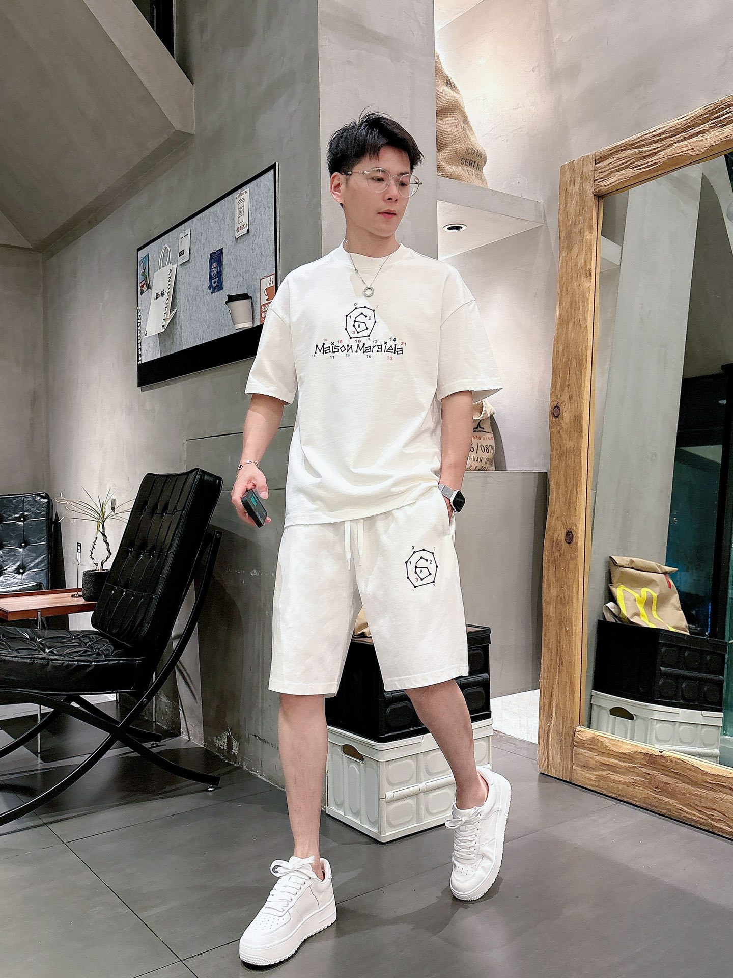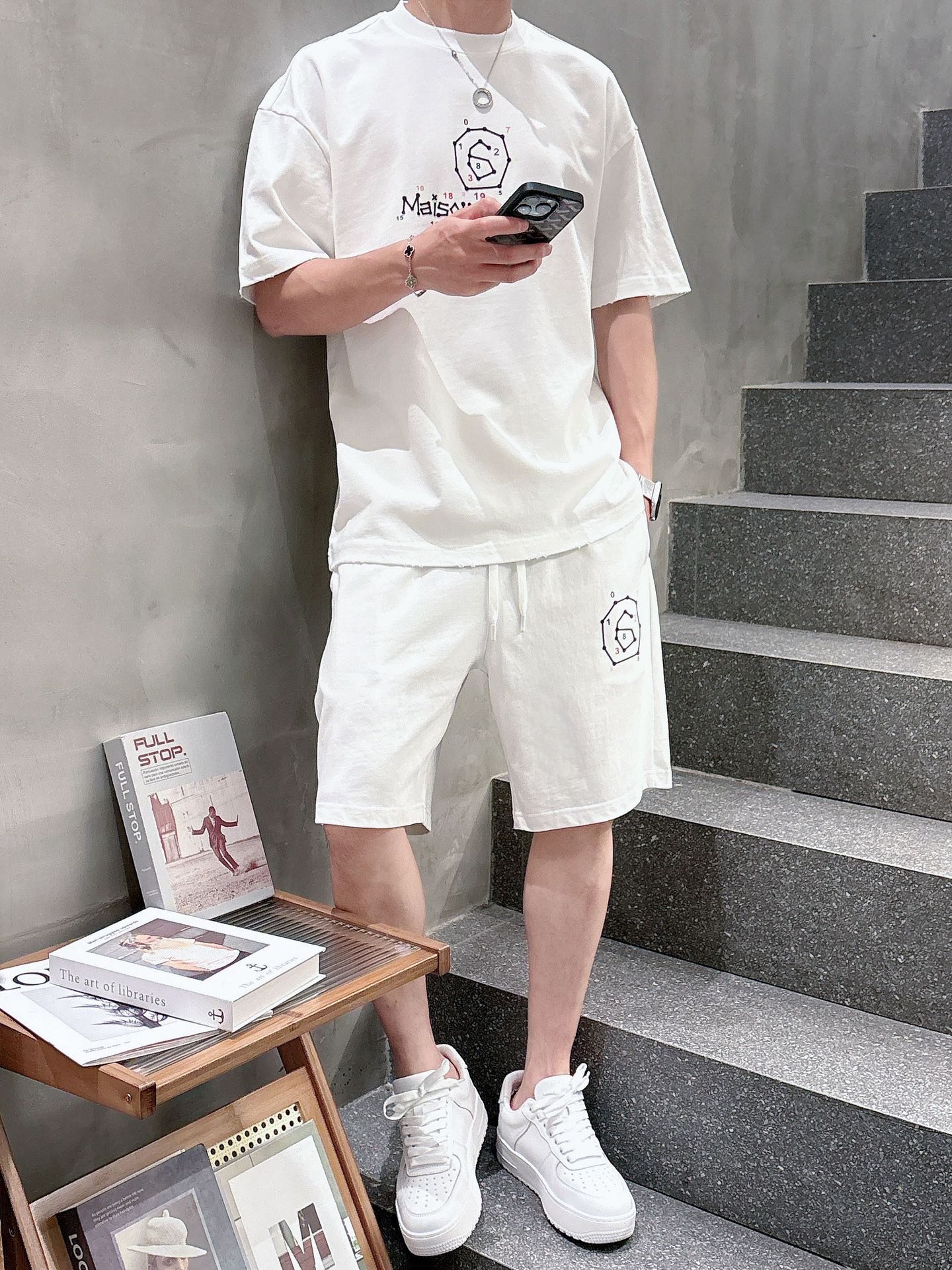 MM6 Majilla ???? high-end custom collar, sleeve hem with perforated design. New spring/summer 2025 collection first release at the counter. The latest short-sleeved and short-shorts casual set. Heavy concave and convex pattern design. High-end pure cotton custom design, avant-garde and fashionable! The brand logo emphasizes high-end custom pure cotton fabric with meticulous craftsmanship design. Soft to the touch. Comfortable to wear. Counter level exquisite vehicle lines. The workmanship is exquisite. The wearing effect is incredibly cool! Essential items for stylish men! Size: M-2XL loose style. Please report your height and weight