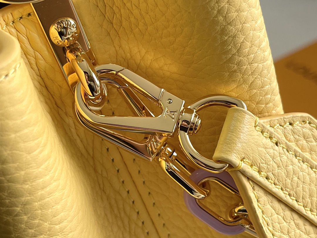 With full set PACKAGING [PREMIUM ORIGINAL factory leather M21798??M21634 chicken yellow gold buckle] This Capucines BB handbag is made of Taurillon leather. The metal and resin chain links are interlocking with each other to create a detachable chain, allowing you to switch freely between colorful charm and elegant elegance. The wide shoulder straps and top handle add multiple carrying options. Detailed characteristics 27 x 18 x 9 centimeters (Length x height x Width)