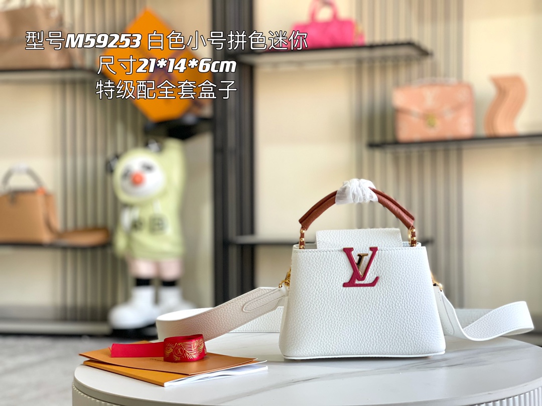 With full set packaging [PREMIUM ORIGINAL leather ??M59253 milk white blend with light earthy yellow] This Capucines mini handbag is made of grainy Taurillon cowhide, giving the bag body, top handle and flip cover a color block charm. The LV letters enrich the visual layers, and the detachable wide shoulder straps ensure a comfortable shoulder and back. Detailed dimensions: 21 x 14 x 8 centimeters (Length x height x Width)