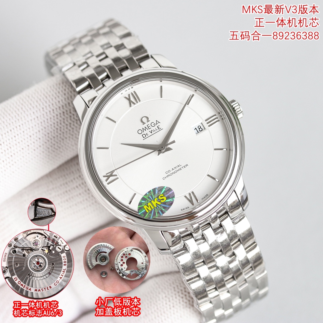 Omega de Ville, five yards in one, newly introduced with a choice between transparent and closed case back, ?? code 89236388 MKS is dedicated to carrying forward the classics. This is a 39.5mm Swiss Chronometer watch of ultimate quality from Diffier. This watch features an elegant and slim appearance, combined with a simple and generous design. It captures every detail and perfectly interprets the classic charm of the original elegant business. This wristwatch measures 39.5mm x 10mm. The literal scale and hands all inherit the original factory process. They are first finely ground and polished, and then rhodium-plated to ensure a lasting luster and an astonishing appearance. The Omega resistor LOGO on this watch dial has a well-rounded arc and a natural chamfer at the edge. It may seem small and exquisite, not worth mentioning, but in fact, it is intricately crafted and full of profound wisdom. This watch is made of the original mother-child through steel band in a 1:1 mold. The depth of corrosion of the Logo on the outside is consistent. The Omega symbol has a three-dimensional effect and texture. The rivets on the clasp are the same as the original, all of which are CNC integrated with the clasp in one go, solving the problem of rivets often falling off or breaking. 4: The latest effort of MKS factory adopts self-DEVELOPED TRUE 8800 Octopus ?? integrated movement, calendar jump, not the common plate movement in the market, comparable to other common versions in the market, truly zero repair. Omega De Ville, please recognize MKS, watch ?? code 89236388