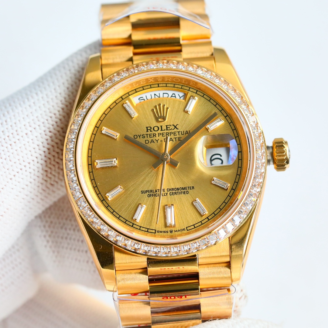 ROLEX Day-Log 36 series ??EA1 1 ? with 2836 movement, quality is stable and reliable; 2 ? Consistent with original thickness 11mm Ultra-thin: dial diameter 36mm; Correct the deficiencies of other versions in the market. The size and thickness of other versions in the market are incorrect and they are fake at first glance. 3 ? The dial is made of 18ct gold, set with diamonds, and set with square diamonds, also known as rock sugar diamonds, ?? 4 ? One-piece middle case, screw-down caseback and winding crown; 5 ? Top-notch workmanship, each strap fits perfectly with the lugs, providing ultimate comfort on the wrist;