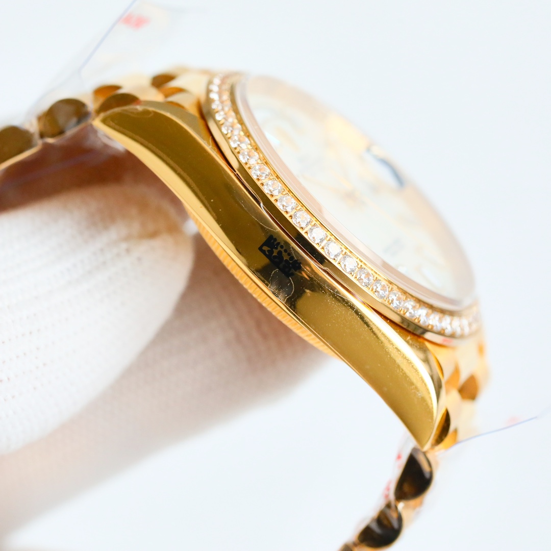 ROLEX Day-Log 36 series ??EA1 1 ? with 2836 movement, quality is stable and reliable; 2 ? Consistent with original thickness 11mm Ultra-thin: dial diameter 36mm; Correct the deficiencies of other versions in the market. The size and thickness of other versions in the market are incorrect and they are fake at first glance. 3 ? The dial is made of 18ct gold, set with diamonds, and set with square diamonds, also known as rock sugar diamonds, ?? 4 ? One-piece middle case, screw-down caseback and winding crown; 5 ? Top-notch workmanship, each strap fits perfectly with the lugs, providing ultimate comfort on the wrist;