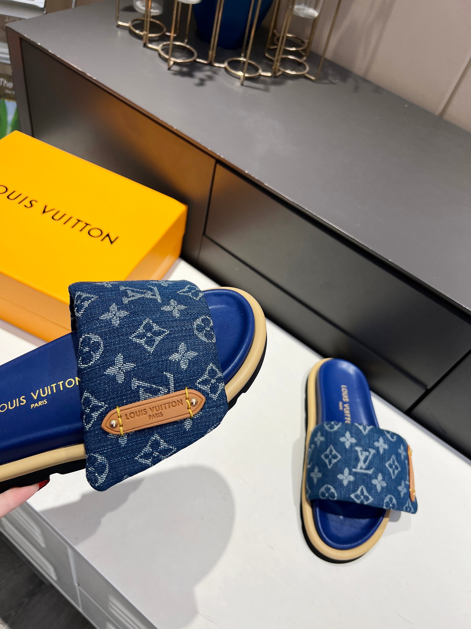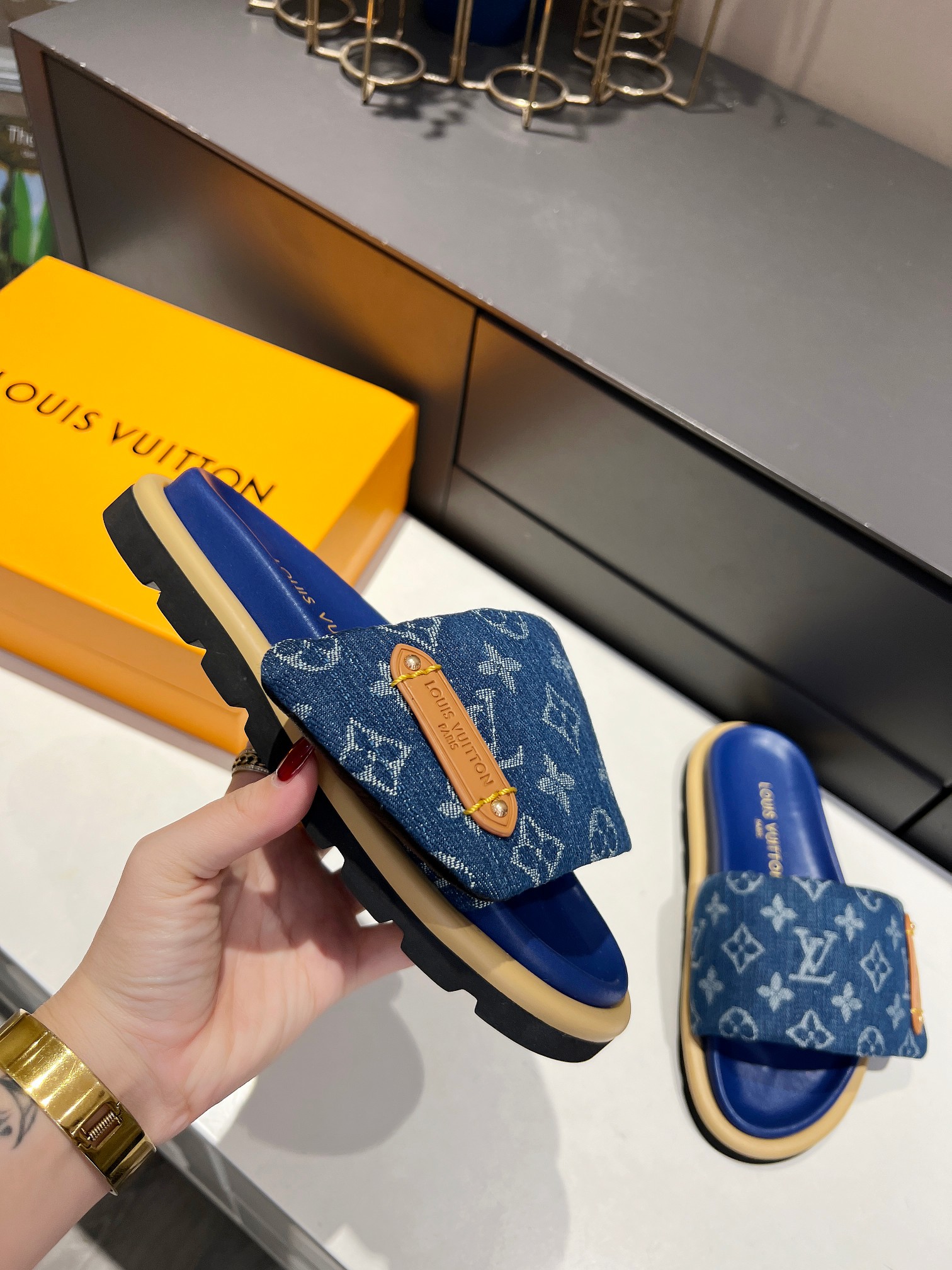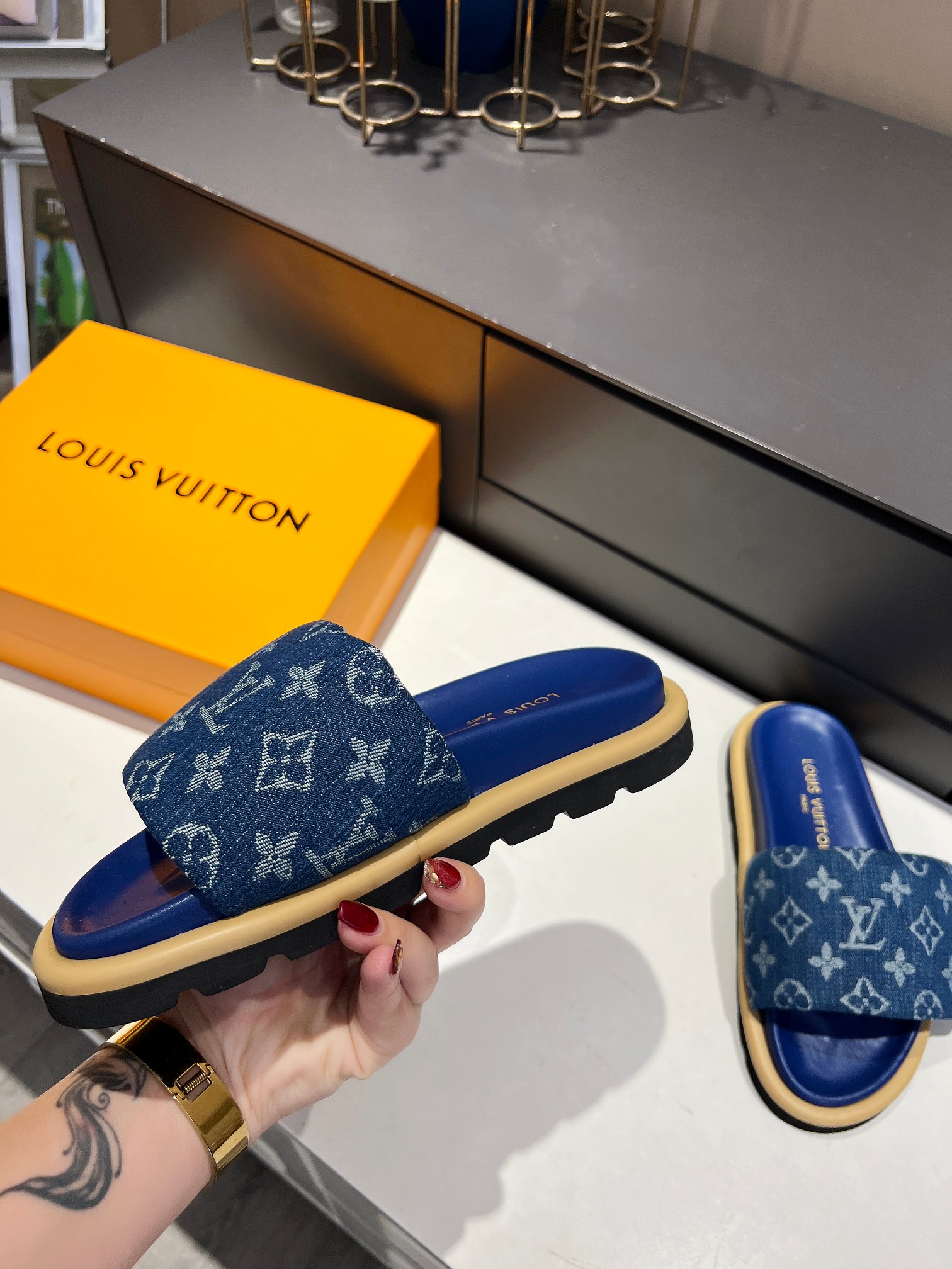 Style #2004??????. L Donkey L Family's best-selling embossed logo patterned flip-flops. This Pool Pillow Comfort flat-bottomed flip-flops is made of technological fabric and reinterprets the Monogram pattern with high-frequency embossing technology. Soft padded upper with adjustable Velcro, comfortable and resilient insole with harmonious color ?? Fabric: Original custom tech fabric ?? Lining: Soft sheepskin ?? Sole: Original molded rubber foam outsole ??Size: 35-44 (45.46. Custom-made